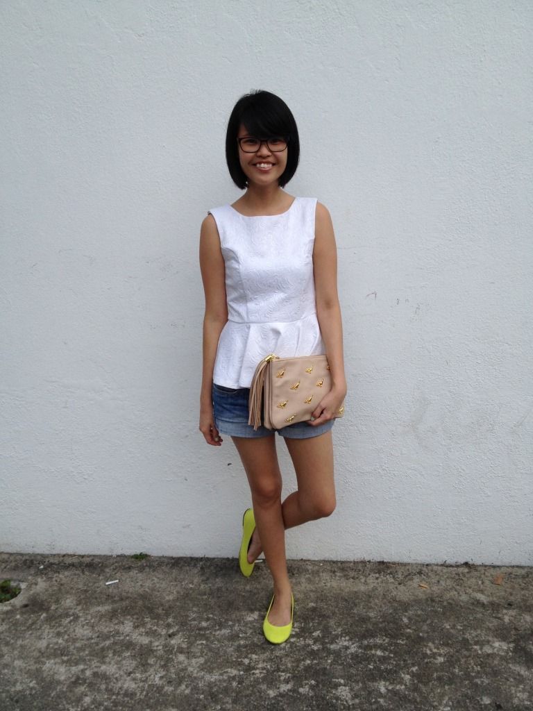 Outfit of the Day: Peplum top fromThe Stage Walk, denim shorts, clutch from ASOS and neon pumps from H&M.