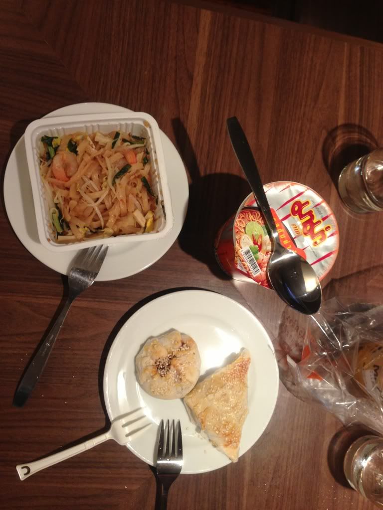 Microwavable pad thai, cup noodles and char siew puff!