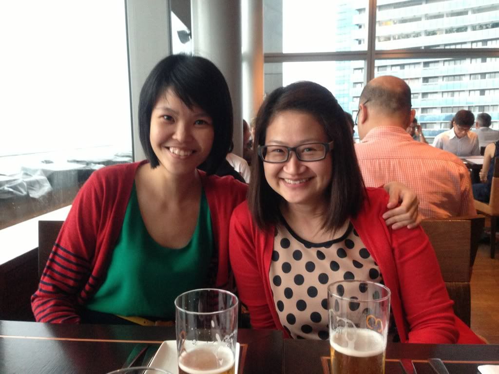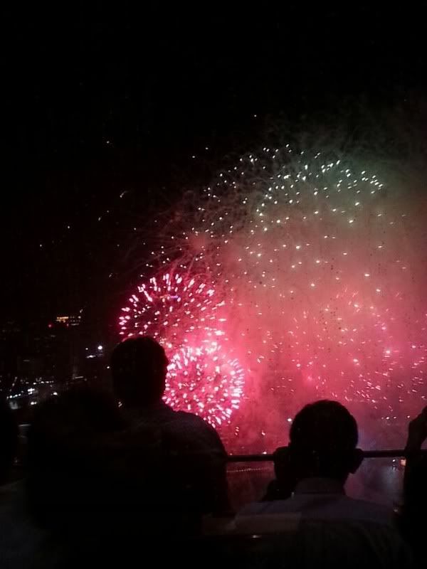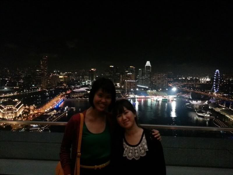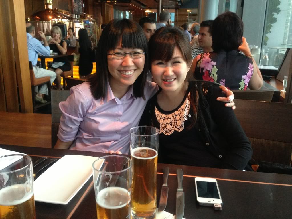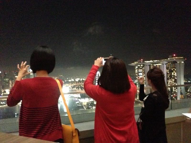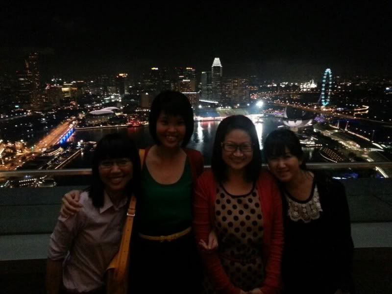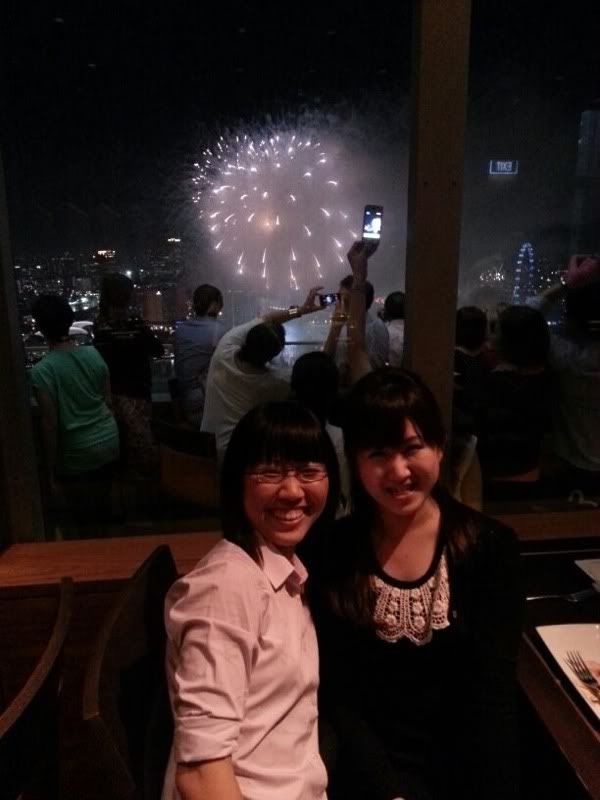 We are off to Level 33 for a chillax dinner!Level 33 Marina Bay Financial Centre Tower 1 8 Marina Boulevard Singapore 018981 We made a reservation and got a table indoors. We actually wanted to sit outside but they were reserved for drinking. Luckily we didn't sit outdoors. It started raining later in the evening! Heng ah... What's relaxing without alcohol? It's really quite expensive, the alcohol. Happy hour is until 8pm. So be sure to place your orders before 8! My two cute petite girls - Aileen and Priscilla! They are really so petite that I feel like a fat giant beside them. Life's unfair! Rachel and I. We have great telepathy, always wearing the same colours!Starter: Quail Pan seared breast, celeriac puree, chargrilled savoy, fava beans and caramel malt jus. Quite yummy! Maybe because we were too hungry. haha..Mains: Wagyu Steak I can't remember the description for this but the steak is really good. Much better than Back & Belly.Mains: Back & Belly Chargrilled 200 days aged Stockyard sirloin and slowly braised blackened Wagyu brisket, potato onion hash, blistered tomato and wild mushroom jus. They both taste the same but just slightly different. Don't really like braised stuff so I won't recommend this. Halfway through the meal, there were fireworks! We are so lucky to have the view right in front of us! Many people gather around our table to get a good shot of the beautiful fireworks! After we are done with dinner, we just had to go out to admire this fabulous night scene of Singapore's CBD area. Ya, as you can see. We are very excited about this place. All so sua ku, like we have never seen it before. *embarrassing but who cares?* yay! I love my girls!