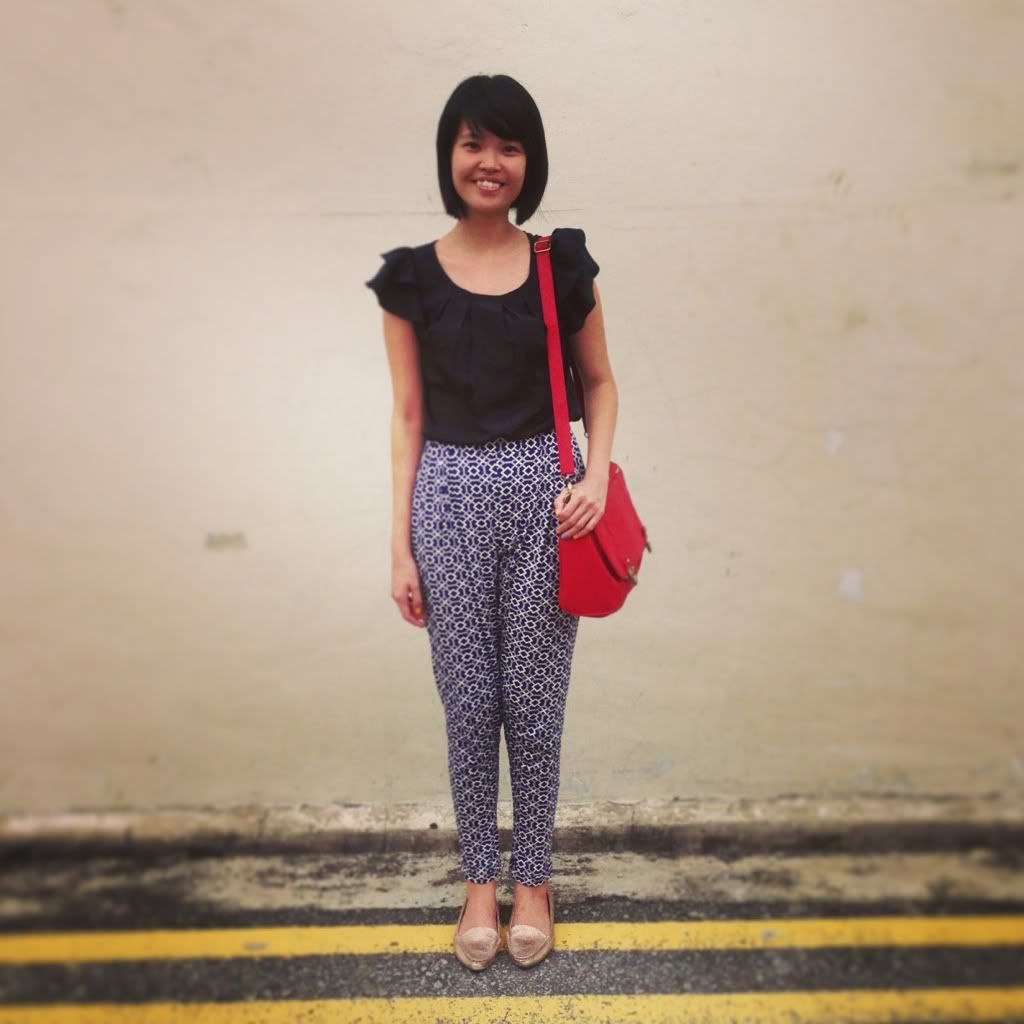 We were off to the East on a weekend and decided to explore the area around Katong 112.Nine Thirty by Awfully Chocolate 131 East Coast RoadEggs Benedict - $16 Price is very steep, in my opinion. ONLY one egg! With only a small serving of smoked salmon. I definitely won't be back for more.Chargrilled chicken with noodle soup - $7.90 Good ol' chicken soup for the soul. Quite nice and something different from the traditional chinese soups I always have. I don't like western creamy soup (other than Campbell's mushroom soup) so this is good for me. Most people were there for the desserts. Of course, right? Since we were at Awfully Chocolate. I, for one, don't fancy Awfully Chocolate at all. Haha, so we didn't try any of the desserts. Outfit of the Day: Black top, printed bottoms and red satchel from ASOS . Loafers from TCL . Till the next post!